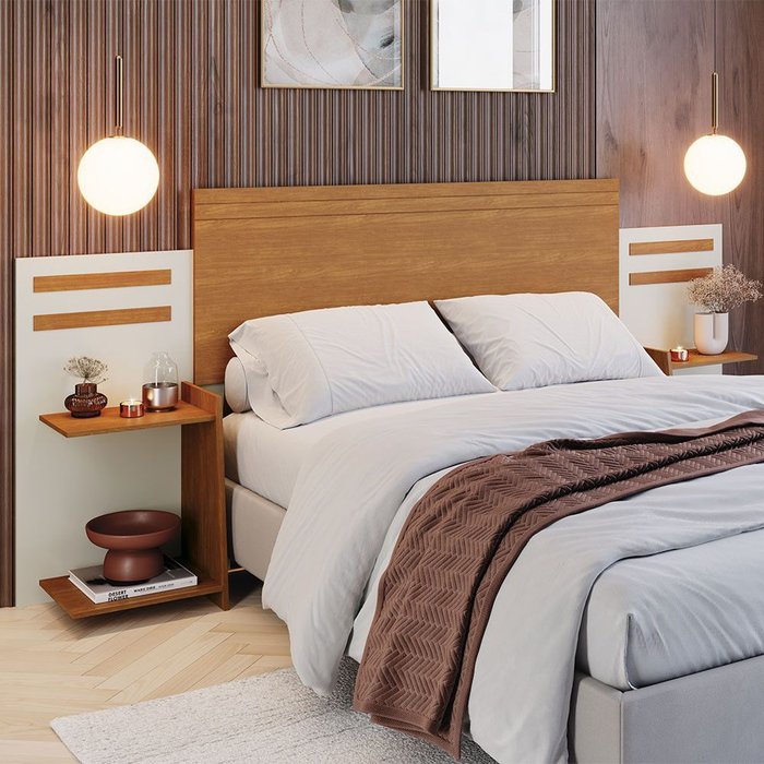 Cabeceira Grécia para Cama Solteiro em MDF 107 cm de Largura com 2 Mesas de Cabeceira Nature/Off White