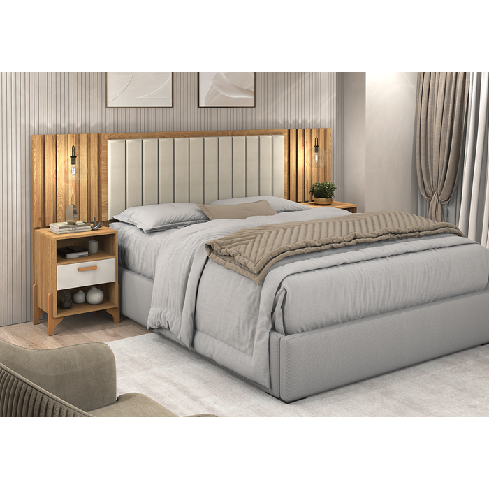Mesas de cabeceira laterais integradas – praticidade no dia a dia Estofado macio – conforto e aconchego Detalhes ripados modernos – toque sofisticado e elegante Design que combina com diferentes estilos de decoração