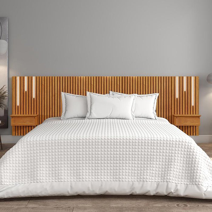 Cabeceira King Paris Ripado Quarto 2 Mesas com Gaveta e Led Naturale