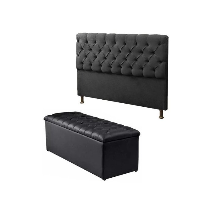 Cabeceira Mais Calçadeira Baú Casal 140cm Para Cama Box Sofia cor Preto Courino Preto