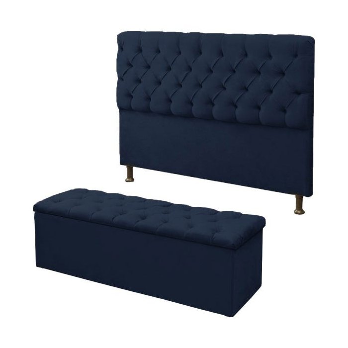 Cabeceira Mais Calçadeira Baú Solteiro 90cm Para Cama Box Sofia Suede Azul Marinho - DS Estofados