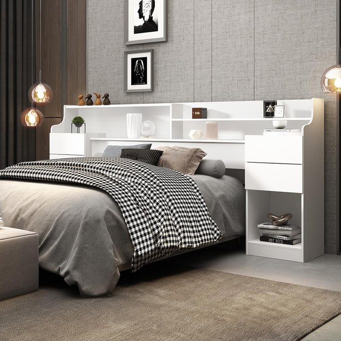 E mais, ela dispõe de uma mesa de cada lado para organizar melhor os seus itens de cabeceira, quatro gavetas com excelente espaço interno, prateleiras resistentes e um acabamento em verniz UV capaz de garantir maior vida útil ao produto.