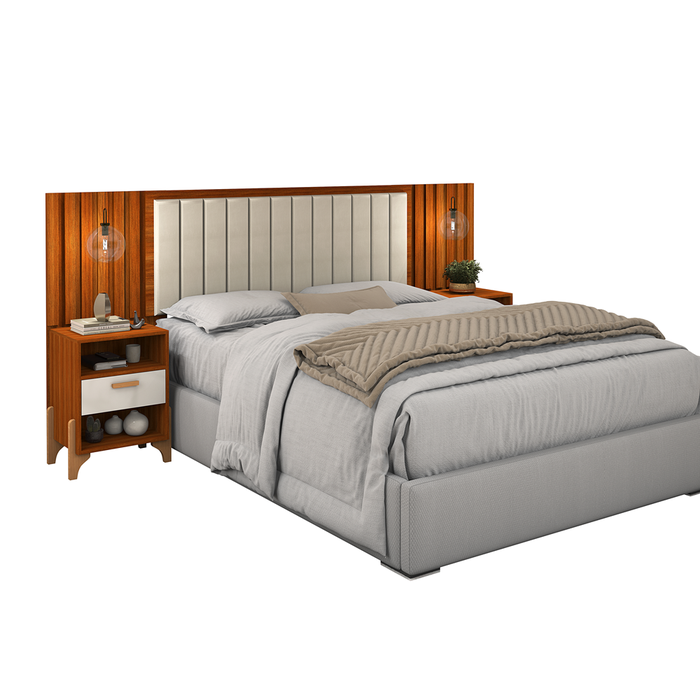 Cabeceira Queen Box Onix Estofada C/ Mesa de Cabeceira Gaveta e Prateleira - Vitamov: Cinamomo/off Cinamomo/Off