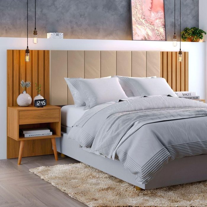 Cabeceira Queen Extensivel Estofada com Mesa de Cabeceira Zara Shop Jm Camaru CAMARU