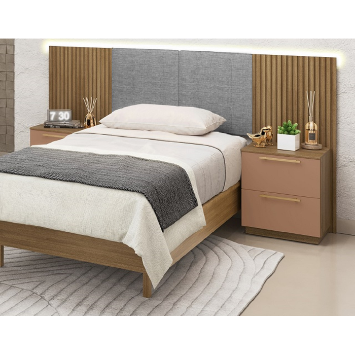 Cabeceira Ripada e Estofada em Linho Cinza com Led e Mesa Lateral Dubai Camarim Vila Rica