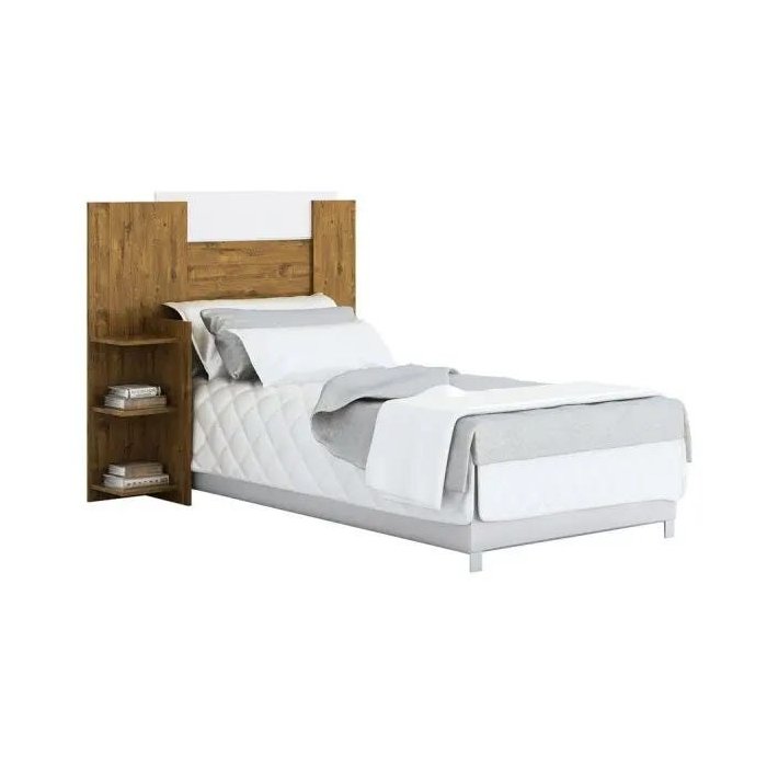A cabeceira Solteiro Lívia é moderna com uma mesa de apoio com três prateleiras.