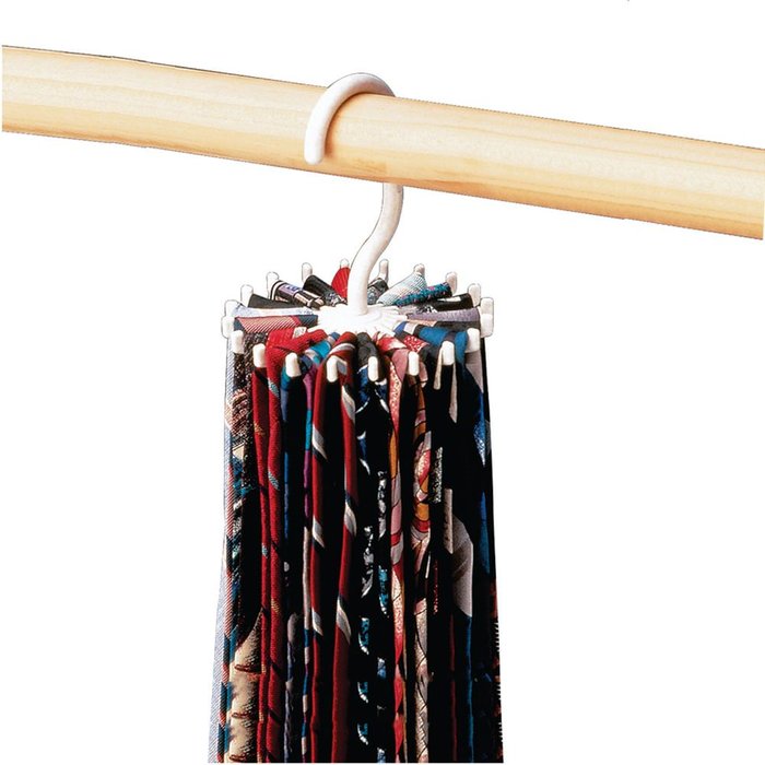Cabide feito em plástico com suporte que gira, facilitando a escolha da gravata.