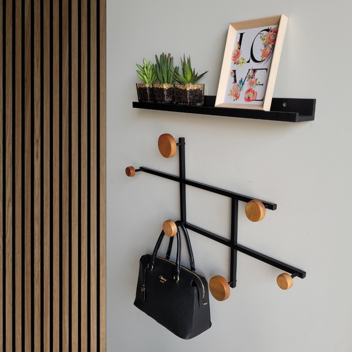 Cabideiro 6 Ganchos Aço e Madeira Escandinavo Calha Decoração MDF Preto/Madeira