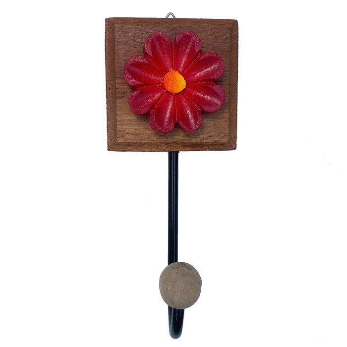 Cabideiro de Parede 1 Gancho Flor de Madeira:Vermelho Madeira Natural com Flor em Vermelho