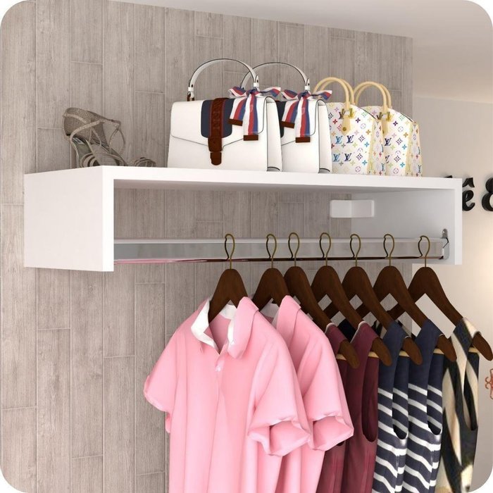 O Cabideiro de Parede é um móvel elegante desenvolvido especialmente para amantes de roupas. Cada peça do Cabideiro foi pensada para agradar aqueles que apreciam boas roupas e que não abrem mão da decoração do ambiente. Esse produto é multiuso, ou seja, pode ser utilizado em vários locais.Ambientes Indicados: Lojas, Lavanderias, Quartos, Closet’s O Cabideiro é fabricado com madeira de 15mm, o tubo da arara é de alumínio com acabamento polido em alto brilho com proteção contra ferrugem e corrosão, o encaixe do tubo com o suporte da madeira é mais resistente devido ao seu formato que prende mais o tubo, isso garante que ele não irá escapar facilmente como acontece em outros modelos. Além de organizar as roupas, o Cabideiro de Parede também possui uma prateleira que pode ser utilizada para armazenar objetos de decoração, livros ou qualquer outro item que desejar. As vantagens são a otimização do espaço, facilidade de acesso às roupas, boa visibilidade na hora de escolher o que vestir e a opção de decorar o ambiente com o espaço disponível na prateleira superior. BENEFÍCIOSAcabamento PremiumDesign CleanEstilo EleganteNão EnferrujaEncaixe perfeito do Tubo da AraraAcompanha parafusos e buchas ESPECIFICAÇÕES TÉCNICASEspessura da madeira: 15mmCor da Madeira: BrancoMaterial da Arara: AlumínioAcabamento da Arara: Polido em Alto BrilhoQuantidade de Prateleira: 1Quantidade de Arara: 1Acompanha Cabides para Roupas: NãoRequer Montagem: SimComplexidade da Montagem: Fácil, pode ser montado por uma pessoa sozinha MEDIDASAltura: 12cmLargura: 60cmProfundidade: 25cm ITENS INCLUSOS1 Cabideiro de ParedeKit de InstalaçãoManual de Instrução de Montagem *As cores podem ter pequenas alterações dependendo do seu monitor ou celular.*Os objetos que ambientam as fotos não acompanham o produto.