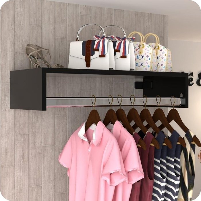 O Cabideiro de Parede é um móvel elegante desenvolvido especialmente para amantes de roupas. Cada peça do Cabideiro foi pensada para agradar aqueles que apreciam boas roupas e que não abrem mão da decoração do ambiente. Esse produto é multiuso, ou seja, pode ser utilizado em vários locais.Ambientes Indicados: Lojas, Lavanderias, Quartos, Closet’s O Cabideiro é fabricado com madeira de 15mm, o tubo da arara é de alumínio com acabamento polido em alto brilho com proteção contra ferrugem e corrosão, o encaixe do tubo com o suporte da madeira é mais resistente devido ao seu formato que prende mais o tubo, isso garante que ele não irá escapar facilmente como acontece em outros modelos. Além de organizar as roupas, o Cabideiro de Parede também possui uma prateleira que pode ser utilizada para armazenar objetos de decoração, livros ou qualquer outro item que desejar. As vantagens são a otimização do espaço, facilidade de acesso às roupas, boa visibilidade na hora de escolher o que vestir e a opção de decorar o ambiente com o espaço disponível na prateleira superior. BENEFÍCIOSAcabamento PremiumDesign CleanEstilo EleganteNão EnferrujaEncaixe perfeito do Tubo da AraraAcompanha parafusos e buchas ESPECIFICAÇÕES TÉCNICASEspessura da madeira: 15mmCor da Madeira: PretoMaterial da Arara: AlumínioAcabamento da Arara: Polido em Alto BrilhoQuantidade de Prateleira: 1Quantidade de Arara: 1Acompanha Cabides para Roupas: NãoRequer Montagem: SimComplexidade da Montagem: Fácil, pode ser montado por uma pessoa sozinha MEDIDASAltura: 12cmLargura: 60cmProfundidade: 25cm ITENS INCLUSOS1 Cabideiro de ParedeKit de InstalaçãoManual de Instrução de Montagem *As cores podem ter pequenas alterações dependendo do seu monitor ou celular.*Os objetos que ambientam as fotos não acompanham o produto.