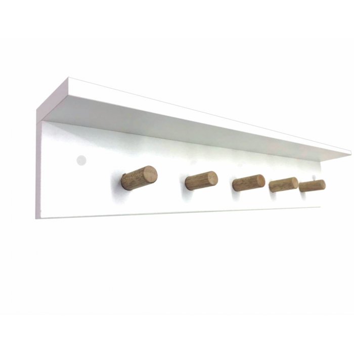 Cabideiro de Parede com Prateleira em Mdf de 18mm para decoração, aromatizador etc. Destaque seu ambiente e faça a diferença! DIMENSÕES- 60cm Largura- 12cm Altura- 9cm Profundidade MATERIALMDF 18mm5 Ganchos Suporta 10kg Por volta de 2KG por pino. Acompanha buchas, Parafusos para Fixação e Tapa Furos Para Acabamento.