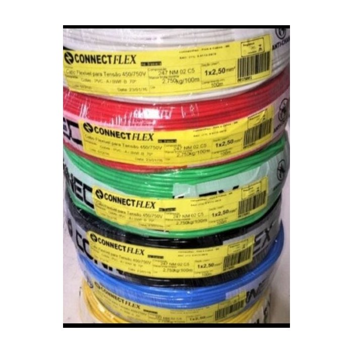 Recomendado para diversas instalações, o fio elétrico flexível 2,5mm pode ser usado em instalaçõesinternas e fixas, em circuitos de força, luz, comandos, sinalizações, e em diversas outras aplicações.Muito utilizado em construções residenciais, comerciais e industriais.Por se tratar de um produto com excelenteflexibilidade, possui maior facilidade de instalação em condutores como conduítese manuseio na hora da instalação.Características do Produtofio elétrico flexível 2,5mm:Produto Flexível;Produto Anti-chama;Alta resistência;Multi Filamentos;Seis opções de cores;100 metros ininterruptos.Especificações Técnicas:Cabo Flexível 1x2,50mmTensão: 450/750vComprimento: 100 metrosCor: PretoMassa: 2,5kgFlexível Classe 5(São cabos comcondutores flexíveiscom encordoamentoclasse 5destinados às instalações fixas em circuitos de luz e força de baixa tensão, de acordo com as maneiras de instalar prescritas na norma de instalações elétricas de baixa tensão NBR 5410.)Aplicação: ResidencialMarca: Connect FlexSegunda Classe