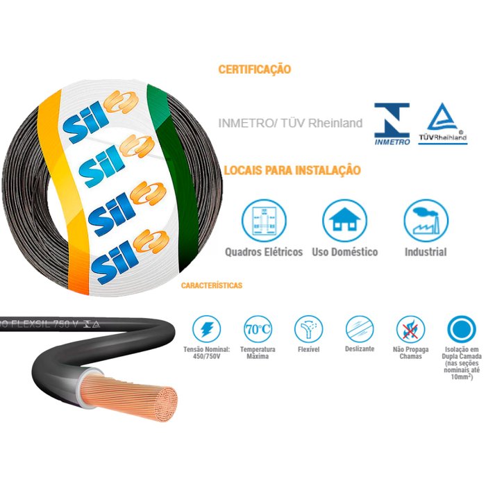 Conheça os Cabos Flexíveis 750V da Sil indicados para instalações internas e fixas em circuitos de força, luz, comandos e sinalizações de residências, comércios e industrias. Sua instalação e manuseio é facilitada pela sua flexibilidade (extra flexível). Sua condução e feita por fios de cobre que atendem as normas ABNT NM 280 que suportam até 750 volts de tensão isolados por uma camada dupla de polivinílico , tipo BWF resistente a propagação de chamas, sendo que a camada externa possui característica extra deslizante facilitando a aplicação do produto em elétrodutos. - Tensão Nominal: 450V~750V - Temperatura Máxima: 70º