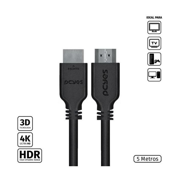 Os cabos da PCYES chegaram para determinar um novo patamar de qualidade para aqueles que buscam mais para seus equipamentos de nível profissional, unindo inovação a um custo acessível! são duas linhas completamente desenvolvidas para suprir as necessidades até do consumidor mais exigente, utilizando de design, alta tecnologia e materiais de qualidade para alcançar a excelência. Projetados com foco nos entusiastas, os cabos da PCYES possuem design exclusivo e 100% brasileiro, que combina robustez com minimalismo, além de levar em si a essência da marca, garantindo maior durabilidade e desempenho. Descrição: Este cabo é indicado para dispositivos que possuam conexão HDMI tais como: TVs, monitores, Aparelhos Blu-ray, video-games, placas de vídeo, notebooks etc Dados Técnicos: Tamanho do cabo: 5M Material do cabo: cobre puro 28 AWG Largura de banda máxima: 18Gbit/s Resolução máxima: 4K (60Hz) Máximo de canais de áudio LCPM: 32 Taxa de áudio: 1536 kHz HDR Estático Suporta 3D Possui conexão Ethernet Conector HDMI macho/macho