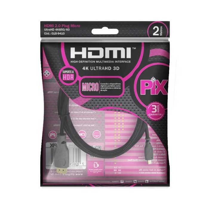 INFORMAÇÕES DO PRODUTO Conexão a dispositivos digitais portáteis como smartphones e câmeras de ação. 4K@50/60Hz 2160p: até 4X mais detalhes que 1080p Dual view: 2 fluxos de vídeo simultâneos Compatível com proporção de cinema 21:9 Transmissão de 4 canais de áudio simultâneos Som imersivo com até 32 canais de áudio Som perfeito: frequência de Áudio até 1536Khz INFORMAÇÕES ADICIONAIS sRGB YCbCr - 4:2/4:4:4 Áudio 24bit, 192Khz, 8 canais LPCM Blu-Ray e HD DVD com resolução máxima CEC - Controle de outros dispositivos DVD Áudio Super Áudio CD Deep Color até 48bit xvYCC Auto Lip-Sync Dolby True HD (Áudio 7.1) DTS-HD Master (Áudio 7.1) CEC Extendido 3D Canal Ethernet Canal de retorno de áudio 4K@30Hz 4K@60Hz Suporte à espaço de cor Rec.2020 Suporte à YCbCr 4:2:0 32 canais de áudio Áudio a 1536 Khz 4 canais de áudio simultâneos 2 canais de vídeo simultâneos (Dual View) Proporção 21:9 Embalagem: Polybag Plug: Micro Série: Padrão Versão do Cabo: 2.0