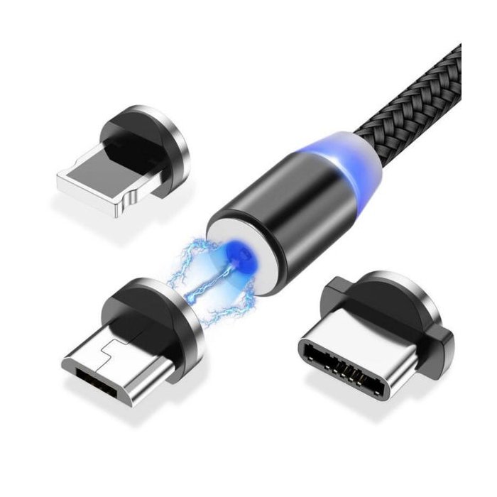 Cabo USB Carregador Magnético Nylon Imã com Luz Rápido 3 em 1 Android e iOS - Cinza