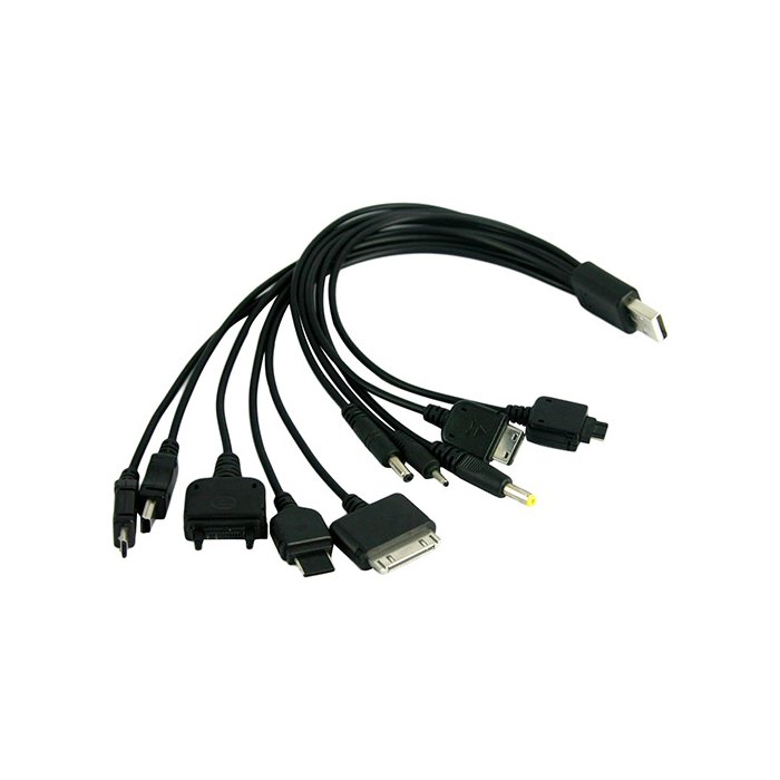 Cabo Usb 10 Saídas É compatível com iPod 30Pin, Samsung , LG 18Pin, Samsung 20Pin, Micro USB, Nokia 2.0, Nokia 3.5, PSP, Mini USB, Sony Ericsson. Com um design moderno, ele é feito com material de alta resistência e qualidade. Cabo em PVC* Não acompanha carregador* , somente para carregamento de baterias (não dados) Conteúdo da Embalagem: Um Cabo USB 10x1