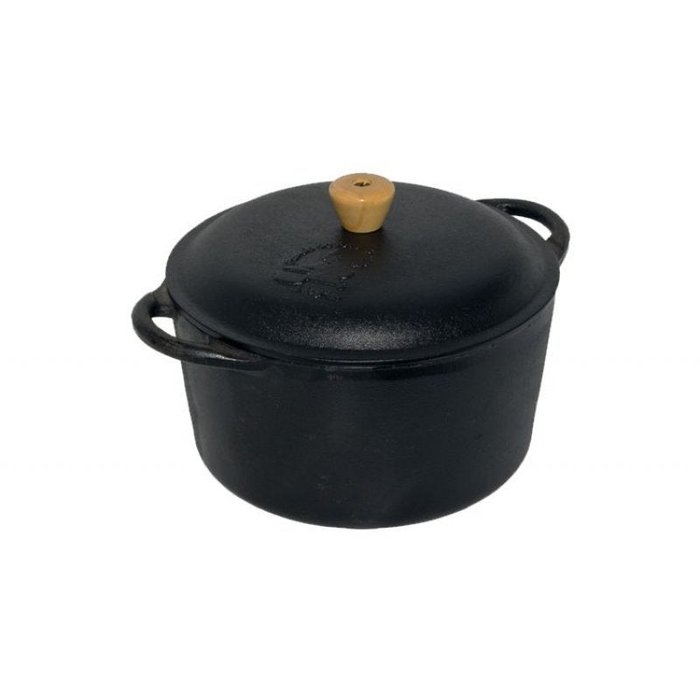 Material (Composição): Corpo e tampa e ferro fundido, pegador de madeira de reflorestamento.