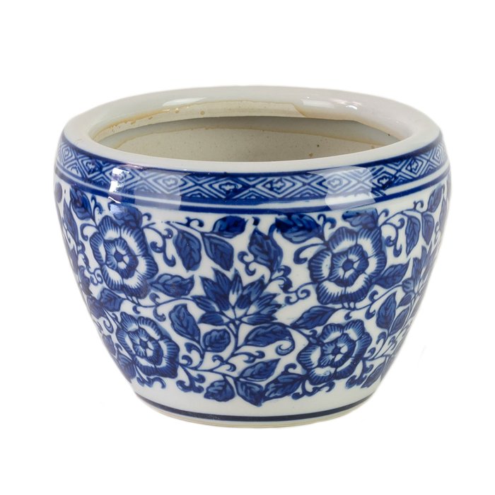 Cachepot Importado Porcelana Azul Branco Com Flores 20x15cm