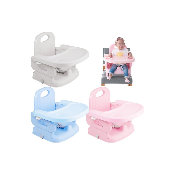 As tiras reguláveis no encosto e no assento ajudam a fixar o produto na cadeira de adulto, o bebê fica seguro com os cintos também reguláveis.
