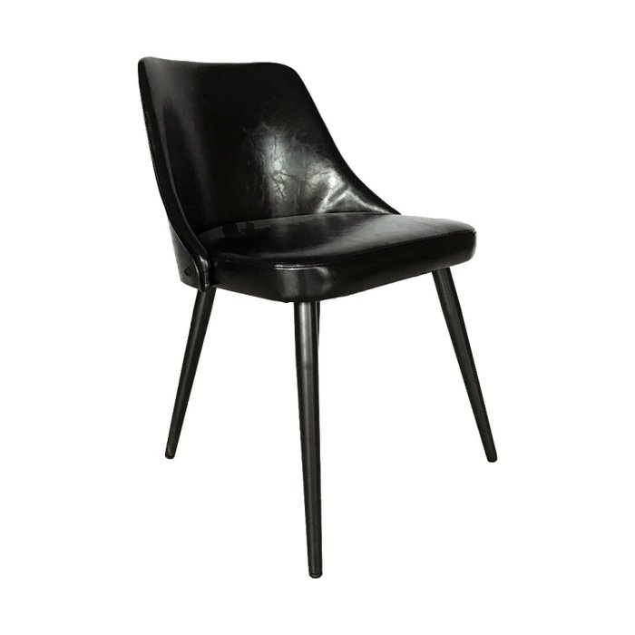 Cadeira em madeira tingida de preto, com assento estofado em PU. Base em aço com pintura à pó.