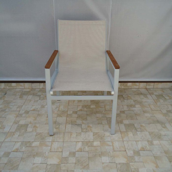 Cadeira Búzios - Alumínio Cinza Claro com Tela Sling Café com Leite com Aplicação em Madeira MÓVEIS