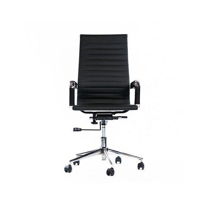 Cadeira modelo Charles Eames Office Esteira Alta Estrutura: Cadeira em Couro Ecológico, esqueleto em aço cromado, possui sistema relax e rodízios em PU Altura: 105 / 114 cm Altura do Assento: 43 / 51 cm Largura: 50 cm Profundidade: 58 cm Altura dos braços: 66 / 76 Garantia: 90 dias contra defeito de fabricação