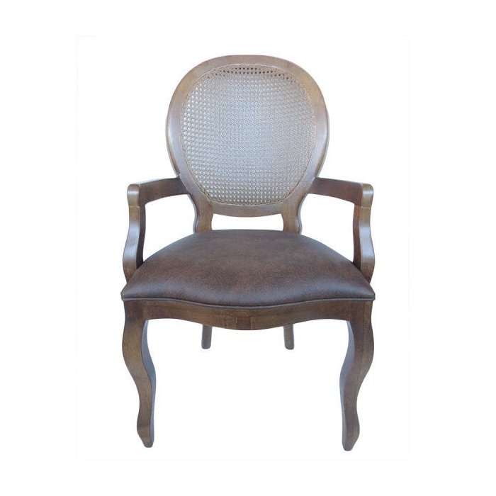Cadeira com Braço Medalhão Imbuia Fosco Encosto Palha Assento Tecido Courino Marrom Amassado