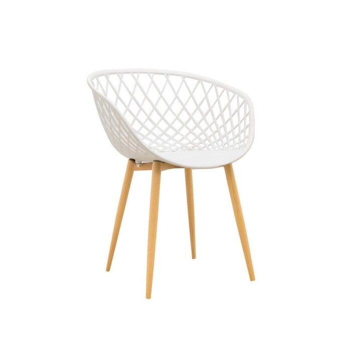 Uma cadeira versátil, perfeita para vários ambientes : desde a mesa de jantar, ao aconchego do quarto. Cadeira com assento em PP, com braços e encosto. Possui base fixa em metal adesivado com textura em madeira.