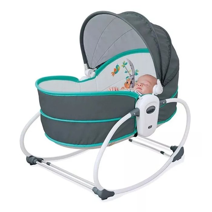 Cadeira De Balanço E Descanso Moisés Mastela 5 Em 1 Verde - Cadeira de balanço de 0 à 3 anos. - Capota é ajustável e removível e ajuda a criar um ambiente sereno e acolhedor na hora do soninho. - São 5 posições reclináveis, prefeitas para brincar, explorar, cochilar e alimentar. - Tem balanço para frente e para trás, e os papais também podem deixá-lo travado no lugar como um assentos parado. - A almofada e macia e confortável. - Acompanha uma barra de brinquedo removível com brinquedos divertidos. - E ainda tem melodias e vibrações para acalmar o bebê. - O berço pode ser removido da estrutura para ser usado como caminha. - Posição 1 e Posição 2 apenas adequada para os modos de berço de viagem, balanço deitado e centro de sonho. - Posição 3 e Posição 4 apenas adequada para o modo “rock & play”. - Posição 5 adequada para o modo de assento confortável, quando trava em uma posição só. - O peso suportado varia conforma a posição: 18 Kg para modo assento, 9 Kg para modo deitado balanço e Rock e Play, 6,800 Kg para modo berço viagem e Dream Center. - Contém capota removível e móbile de brinquedos removível, manual.