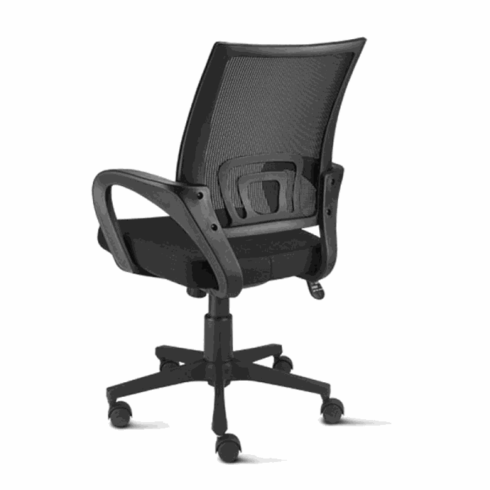 A cadeira para escritório possui base estrelada do tipo aranha, com rodízios em PU (poliuretano) o que garante que ao realizar o movimento de deslize da cadeira, a mesma não danifique o piso, deixando arranhões no piso do escritório. A cadeira possui assento estofado com espuma injetada e revestido em tela de nylon, o que garante a transpiração da pele em contato com o assento, e o encosto é revestido pelo mesmo tecido telado de nylon, deixando com que as costas além de