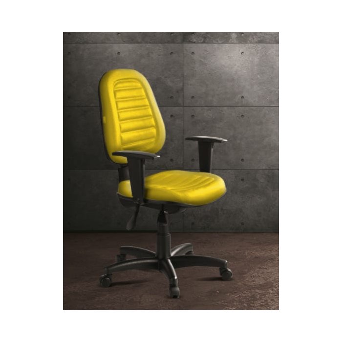 Cadeira executiva espaldar médio/baixo em madeira compensada de 12mm e espuma injetada com 45mm de altura. Base giratória tipo back-system, com regulagem de altura a gás. Costuras laterais (faixas). Costura central na opção: gomada Amarela Claro. Assento e encosto com capa de proteção em polipropileno**.