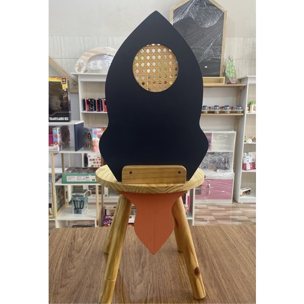 "Experimente o conforto intergaláctico com nossa cadeira de astronauta de foguete, cuidadosamente confeccionada com detalhes de foguete e com uma altura de 60 cm e 30 cm do pé até o assento.