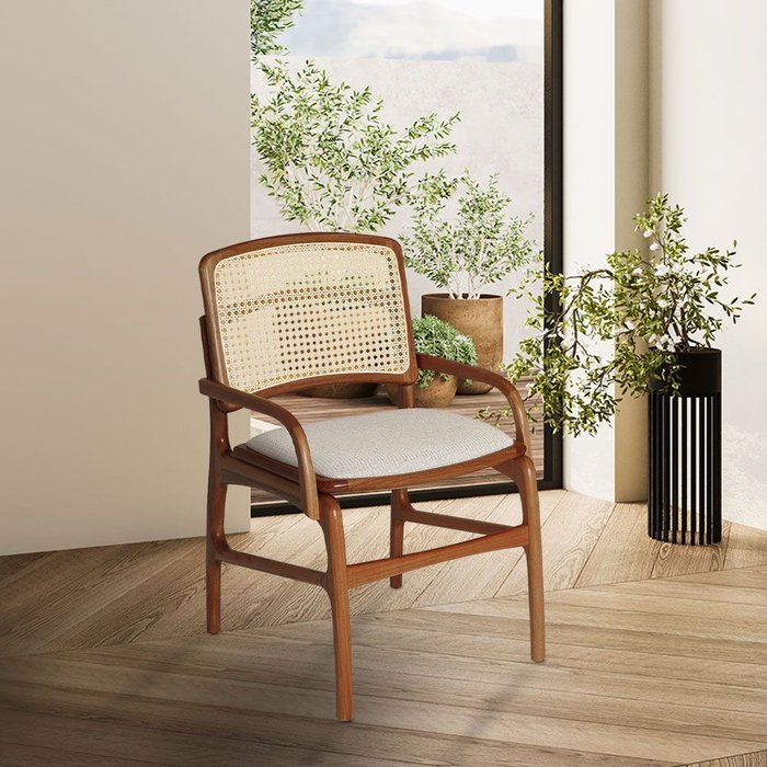 Cadeira de Jantar Florença Madeira Jequitibá Terra com Braço Linho - Bege e Encosto de Palha