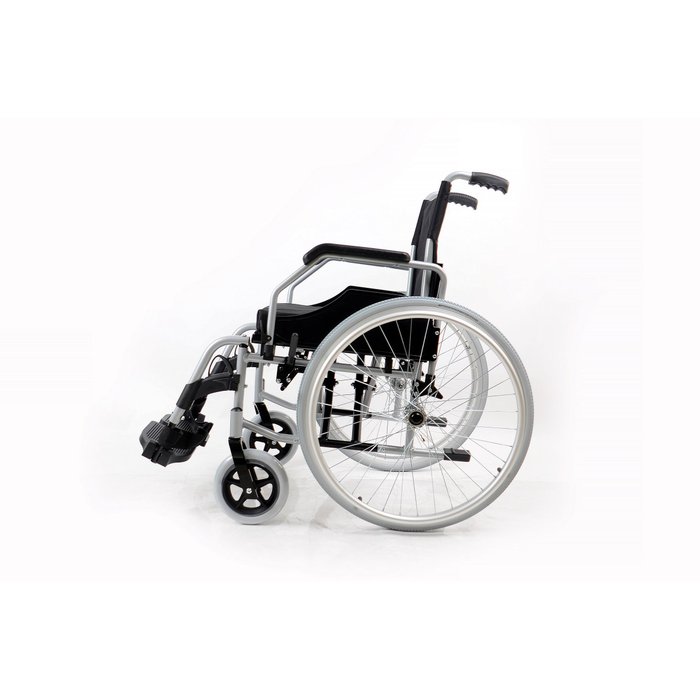 Com estrutura de alumínio aeronáutico, essa cadeira de rodas é leve e resistente. Ela possui sistema em duplo X dobrável, o que facilita o transporte e o armazenamento. Além disso, conta com protetor lateral de roupas, rodas com pneus maciços de fácil remoção através de botão quick release e freios bilaterais reguláveis e ergonômicos.
