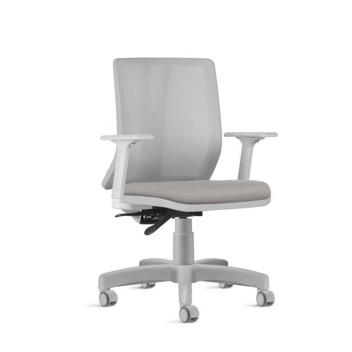 Encosto estruturado em quadro injetado em resina termoplástica de alto desempenho, polipropileno com adição de fibra de vidro, material de excelente tenacidade e ótima resistência mecânica, 100% reciclável, estofado com tela flexível a base de poliéster. Assento estruturado em compensado multi laminado e estofado em espuma flexível injetada de poliuretano, revestimento em tecido tipo crepe. Braços reguláveis em altura através de botão lateral em formato de T contendo apoia braço em Polipropileno. Mecanismo Back System que possibilita ajuste de altura do assento, ajuste de altura do encosto e ajuste de inclinação do encosto, de maneira independente entre si. Pistão classe 3 com 120 mm de curso. Base em aço com capa em Polipropileno de alta resistência. Rodízios de nylon com pistas em nylon.