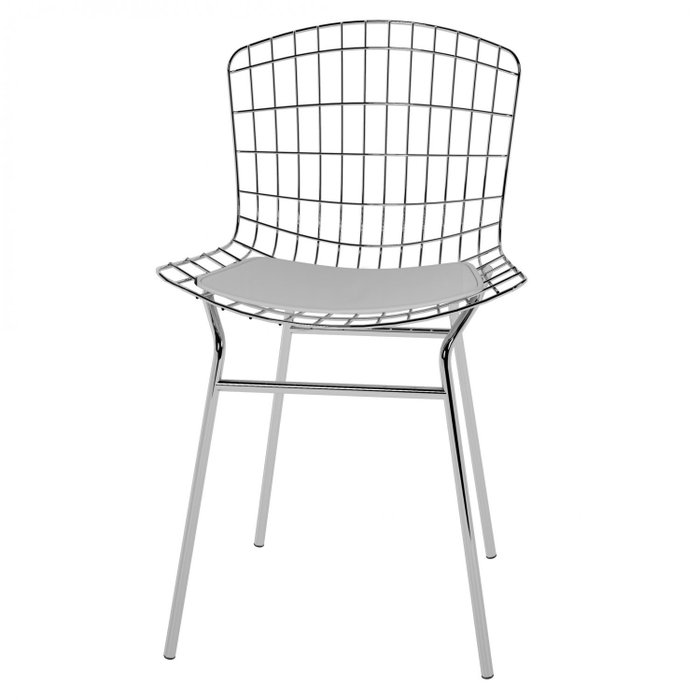 A cadeira PC22 é fabricada em tubos de aço cromados no estilo bertóia, possui encosto aramado e assento estofado preenchido por EVA e revestido por PU branco. Suporta até 100kg.