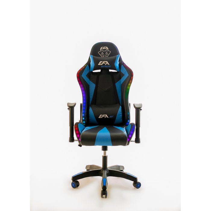 Cadeira confortável, com duas almofadas; regulagem de altura, tornando-se uma cadeira ideal para todas as idades; encosto reclinável em 180º; regulagem de altura. Além disso a cadeira possui RGB em volta.