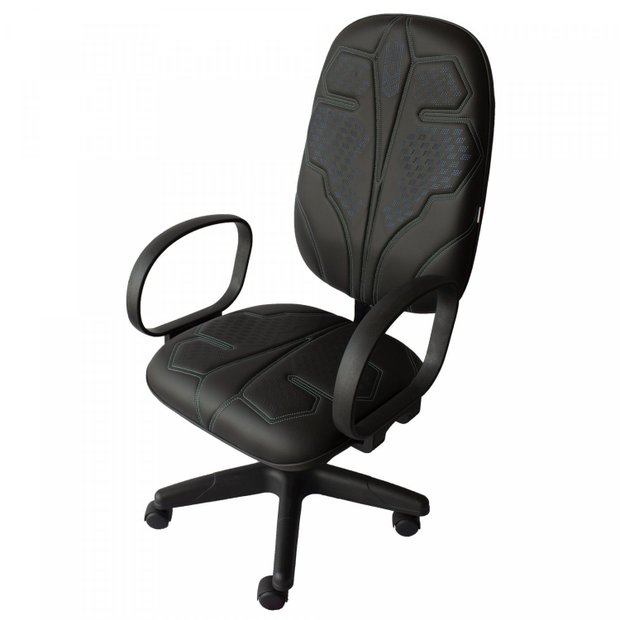 Rodízios em PP (Polipropileno), pistão à gás, braços modelo Corsa, lâmina de aço na junção do assento e encosto, flange padrão, espuma injetada e acabamento em couro ecológico.