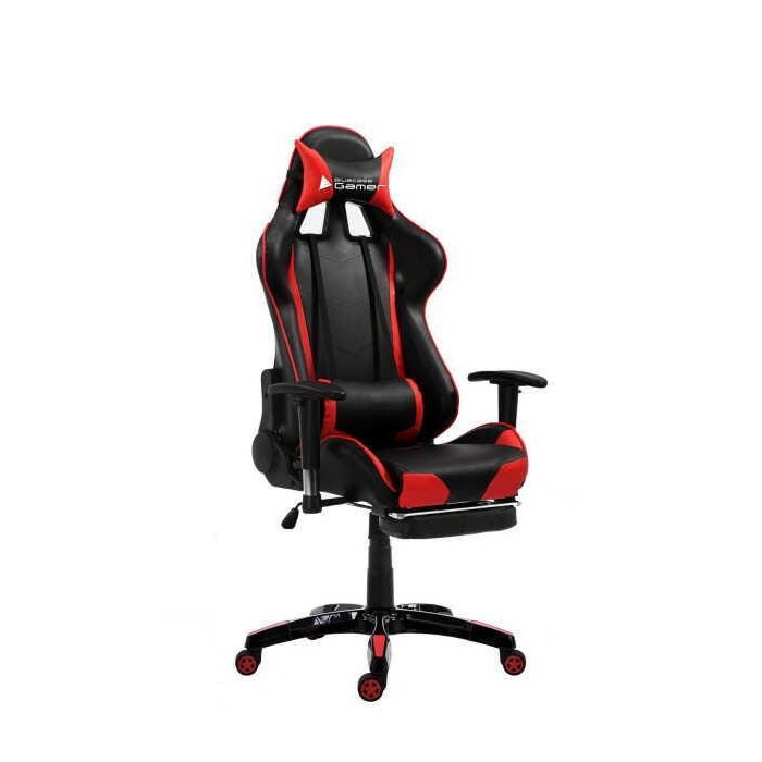 Cor: Vermelho e PretoCouro sintético PUReclinávelApoio de braço ajustável de nylon e metalApoio para os pésBase de nylonClass-4 gas lift 100mm Roda em nylonPeso máximo suportado: 150 Kg
