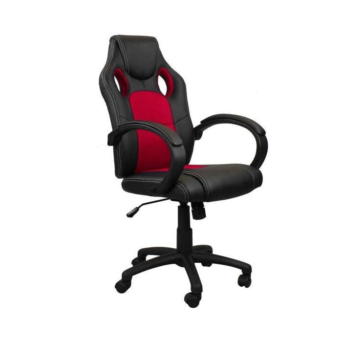 Totalmente revestida em couro PU preto, tem detalhes em vermelho.