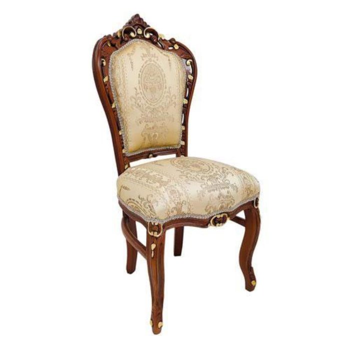 Cadeira Luiz Xv Toda Trabalhada Madeira Marrom Tecido Dourado Arabesco Bege