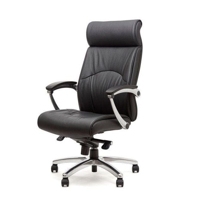 Assento e encosto espaldar alto estofados em espuma laminada e couro natural preto com regulagem de altura por pistão pneumático.