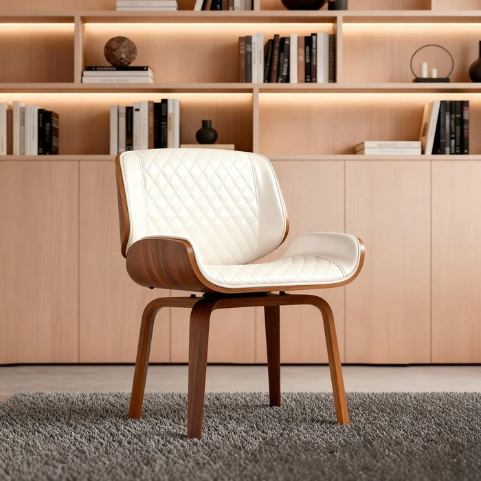 Cadeira Milão Base Fixa Giratória, Couro Sintético e Madeira Nogueira Branca