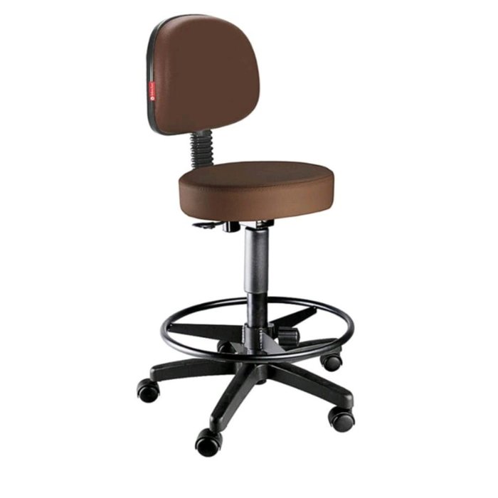 Cadeira mocho - caixa alta - com rodízios - pistão a gás - acabamento do encosto revestido em pvc flexivel - estrutura em aço - revestida em corano.