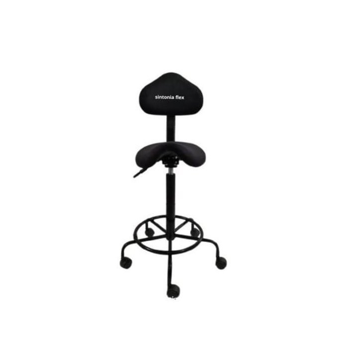 Cadeira sela - regulagem de altura a gás - espuma injetada , revestida em tecido suede - bordas em pvc flexivel - apoio para os pés - estrela de ferro - com rodízios.