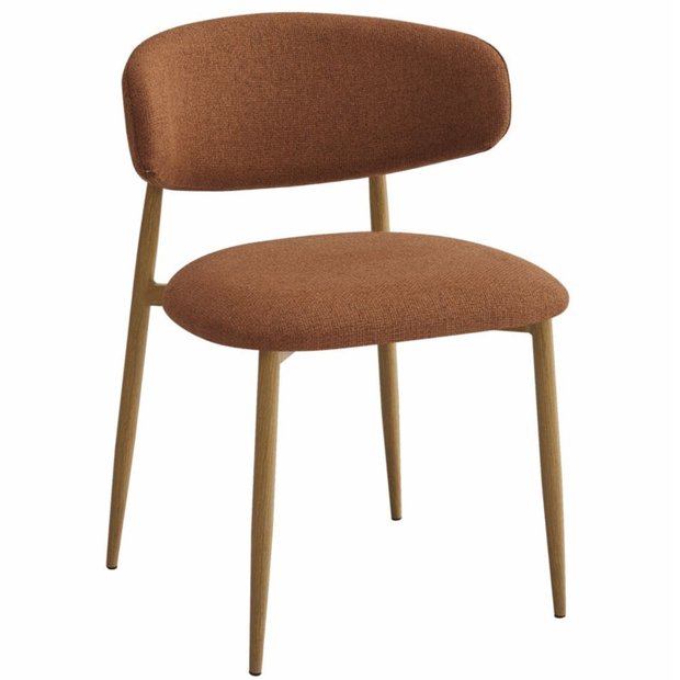 O grande charme desta cadeira está na sua paleta de cores terrosas, que traz calor e elegância ao espaço. A peça conta com um assento revestido em tecido de alta qualidade na cor terracota, que oferece uma textura agradável e macia, garantindo conforto térmico em qualquer estação do ano. Seu encosto levemente curvado é projetado para abraçar as costas, proporcionando uma ergonomia excepcional para longos períodos de uso.
