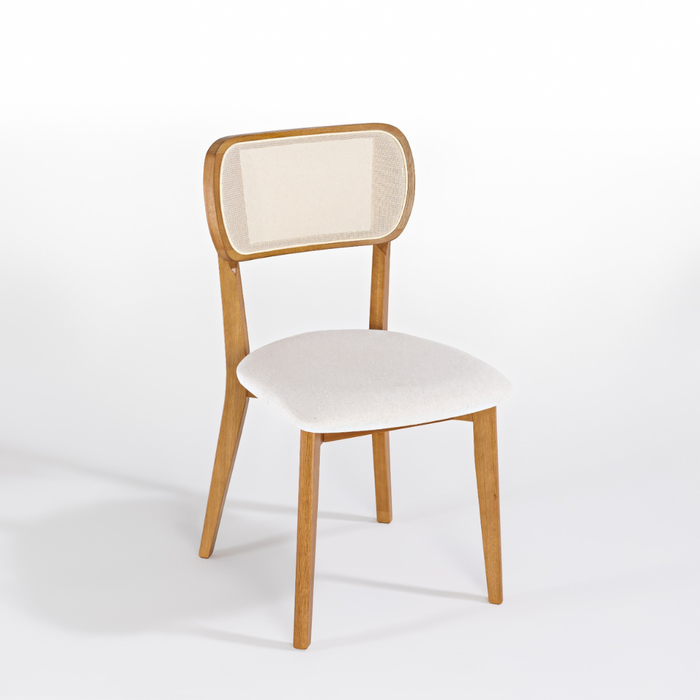A Cadeira Fluire da marca TREO MADE é uma peça que combina curvas orgânicas com um toque artesanal e moderno. Seu encosto em tela quadrada crua e o assento estofado em linho bege criam uma composição leve e sofisticada, ideal para ambientes como salas de jantar, varandas gourmet ou espaços de convivência.