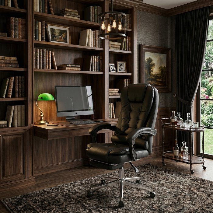 A Cadeira de Escritório Presidente Ergonômica eleva o conforto de seu home office com seu design moderno e apoio para os pés. Perfeita para seu escritório, esta cadeira giratória oferece ergonomia superior, ajuste de altura e encosto reclinável, promovendo o seu bem-estar durante suas horas sentadas.